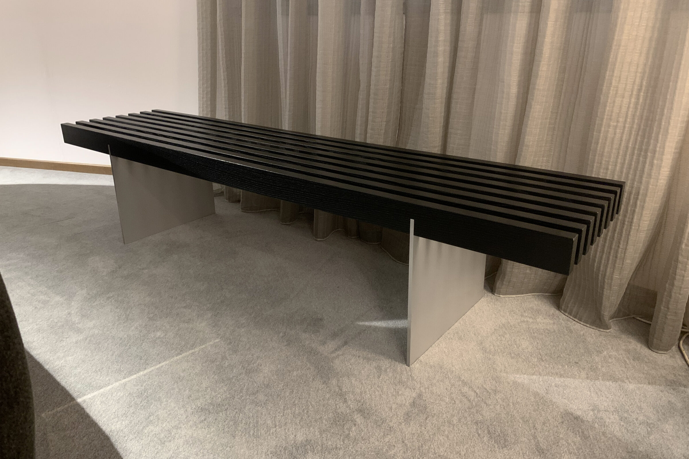 seduta in rovere tinto nero – base in Alu Elox – 200 x 45 x H 45 cm