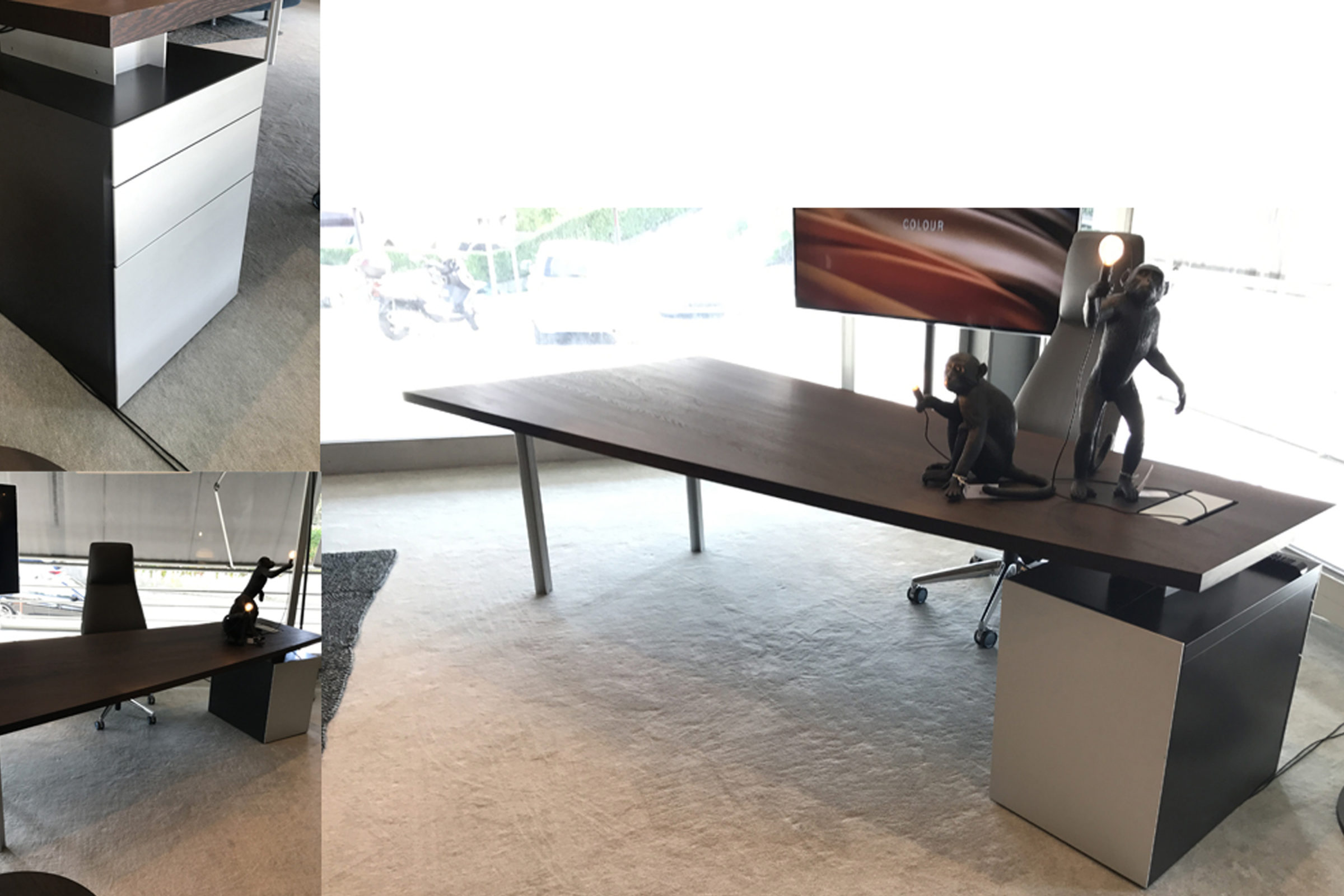 Con piano in wengè massello oliato – con gambe e cassettiera in alluminio spazzolato – 260 x 65/120 x H 75 cm